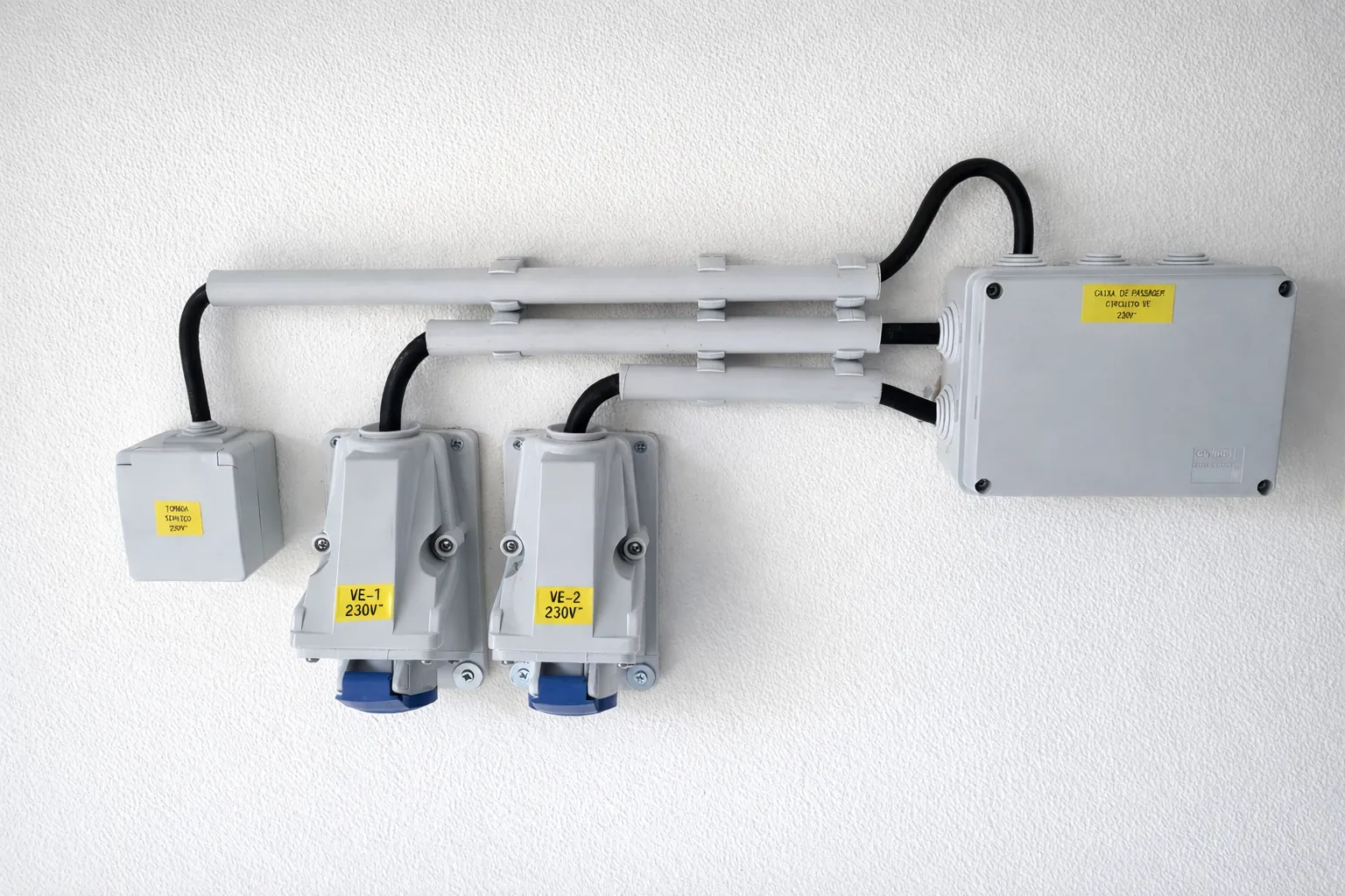 Para quem pretende uma solução mais simples e económica, instalo tomada industrial dedicada com circuito exclusivo para carregamento de veículos elétricos.